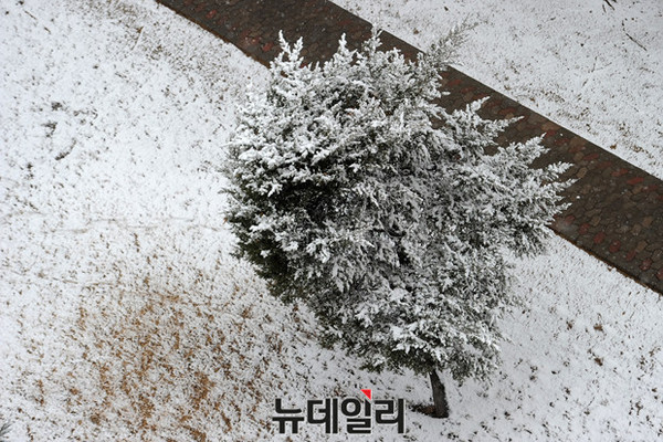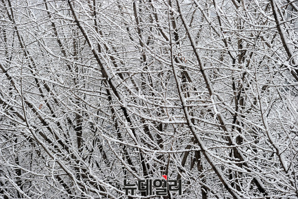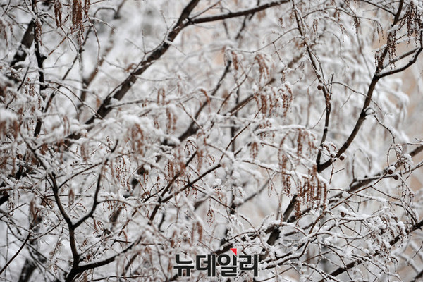 28일 서울을 비롯한 중부 지방 곳곳에 갑작스럽게 눈이 내리는 가운데 성산동 길에서 바라본 가로수에 눈이 쌓이고 있다.