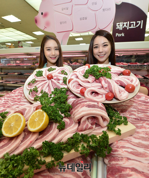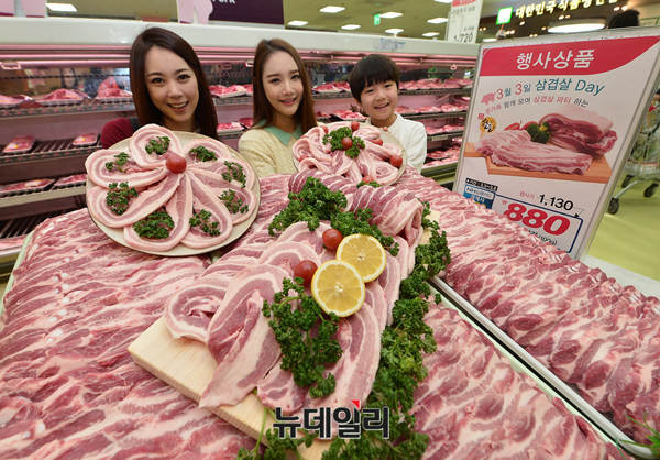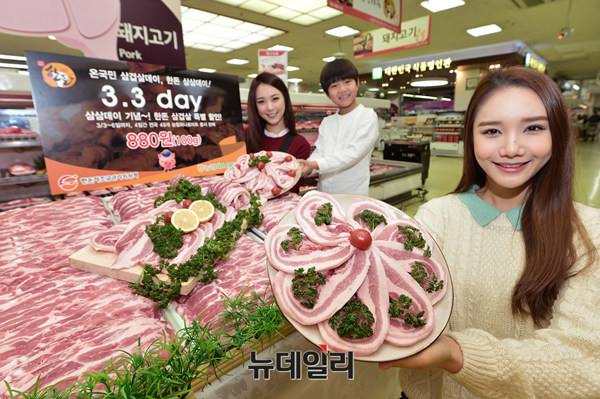 한돈자조금관리위원회와 농협중앙회가 2일 오전 농협 하나로마트 양재점에서 '3월 3일 삼삼데이'를 앞두고 할인 행사를 알리는 사진행사를 실시했다.