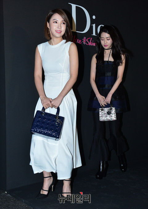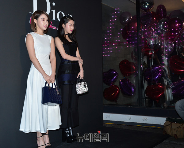이날 출시기념 파티에 참석한 포미닛의 멤버 허가윤과 전지윤이 포토타임을 갖고 있다.