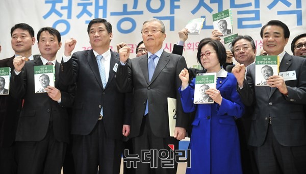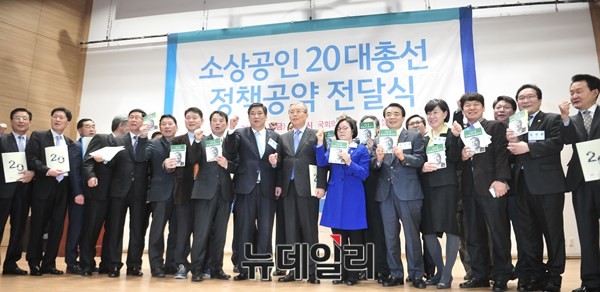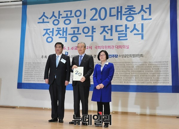 더불어민주당 김종인 비상대책위원회 대표가 4일 오후 서울 여의도 국회 의원회관에서 열린 소상공인 20대 총선 정책공약 전달식에서 참석 인사들과 기념 사진을 촬영하고 있다.