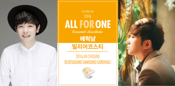 에릭남과 빌리어코스티가 오는 4월 합동 콘서트를 개최한다.'2016 All For One 에릭남&빌리어코스티-카라멜 마끼야또'라는 타이틀로 진행되는 이번 콘서트는 달달한 보이스로 여심을 저격하는 뮤지션 에릭남과 빌리어코스티가 만나 특유의 매력이 넘치는 노래들로 무대를 채운다.2013년 미니앨범 '천국의 문'으로 데뷔한 에릭남은 감미로운 목소리와 훈훈한 외모로 많은 이들의 사랑을 받고 있다. 최근 다양한 해외 스타들을 배려하는 인터뷰를 진행해 눈길을 끌었던 그는 3월 내 본업인 가수로서 컴백해 활동할 예정이다.싱어송라이터 빌리어코스티는 2013년 데뷔와 동시에 매력적인 보컬과 기타 실력은 물론 음악성과 대중성을 넘나드는 음악을 선보여왔다. 특히, 그만의 솔직하고 따뜻함이 묻어 있는 인디 발라드로 호평을 받고 있다.'2016 All For One 에릭남&빌리어코스티-카라멜 마끼야또'는 4월 24일 오후 5시에 블루스퀘어 삼성카드홀에서 단 1회 공연된다. 티켓은 3월 8일 오전 11시부터 인터파크, YES24 사이트를 통해 예매할 수 있다.[사진=씨앤프러덕션]