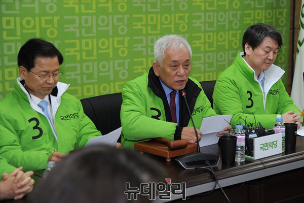 국민의당 김한길 상임선거대책위원장이 7일 오전 열린 선대위원회의에서 공개 모두발언을 하고 있는 가운데, 안철수·천정배 공동대표의 시선이 다른 곳으로 향하고 있다.