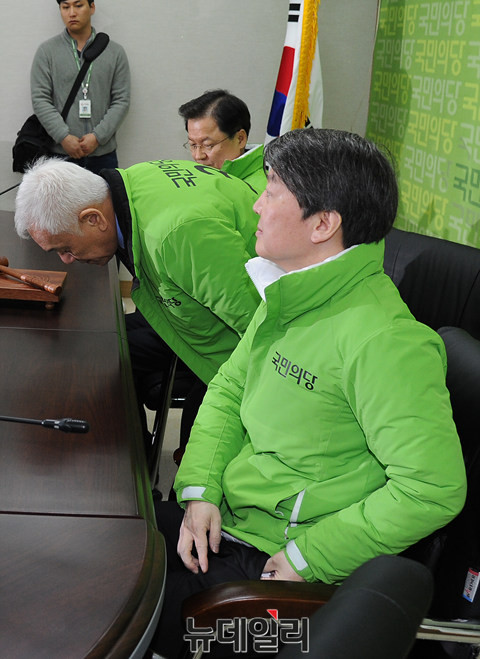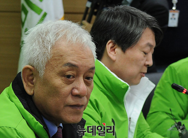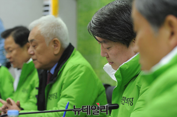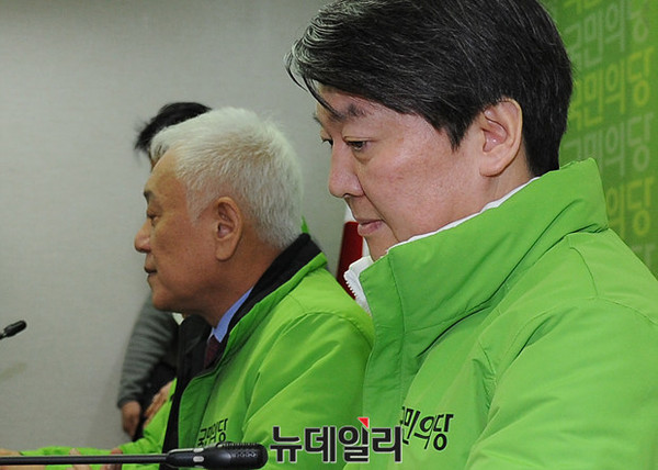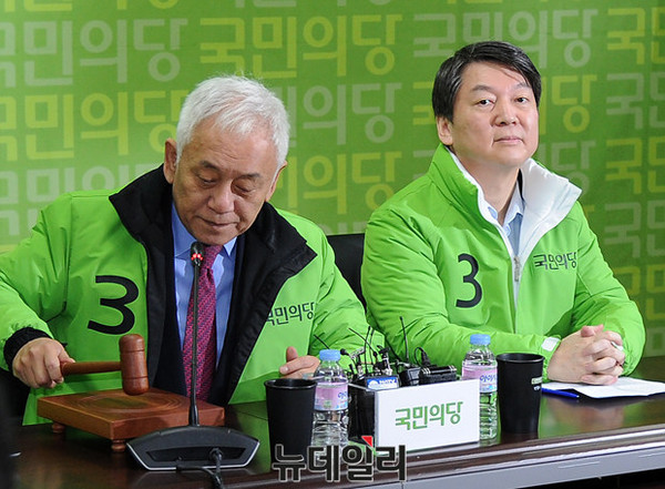 국민의당 선거대책위원회가 7일 오전 서울 마포 국민의당 당사에서 열린 가운데, 안철수 공동대표와 김한길 상임선거대책위원장이 회의에 참석하고 있다.