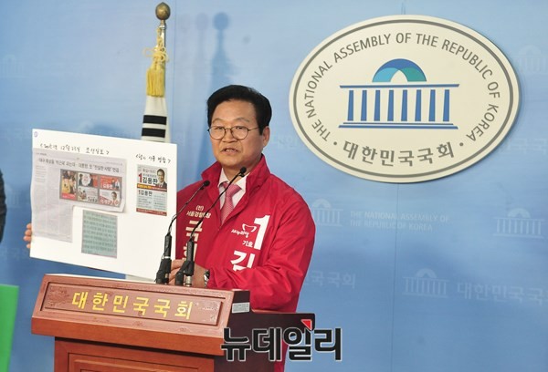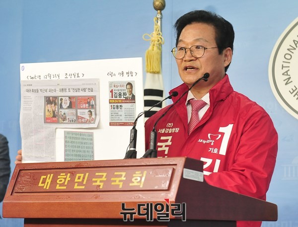 새누리당 대구 달서을 김용판 예비후보가 7일 오전 서울 여의도 국회 정론관에서 '2016총선넷'의 총선 부적격자 발표를 반박 하고 있다.