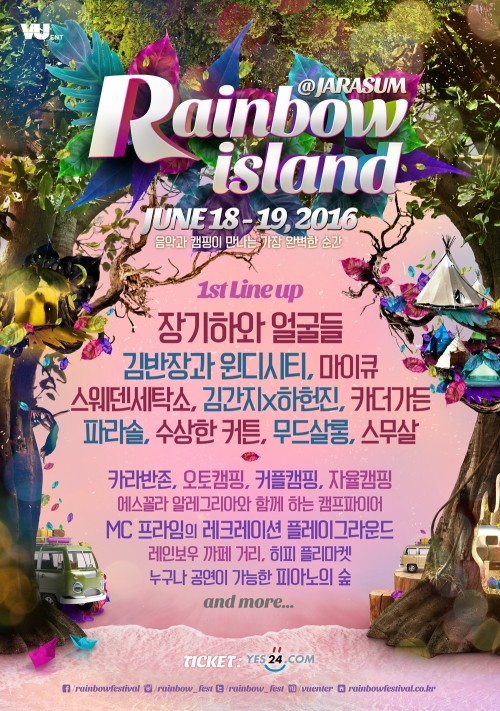 '레인보우 아일랜드 뮤직&캠핑 2016'은 6월 18일부터 6월 19일까지 양일간 경기도 가평군에 위치한 자라섬에서 개최된다. 티켓은 예스24에서 예매할 수 있으며, 2차 라인업은 3월 30일 공개될 예정이다.