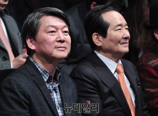 안철수 국민의당 공동대표와 더불어민주당 정세균 의원이 9일 오후 서울 종로구 아름다운 극장에서 열린 '인공지능 알파고와 바둑 콘서트'에 참석해 이세돌 9단과 알파고의 대국을 시청하고 있다.