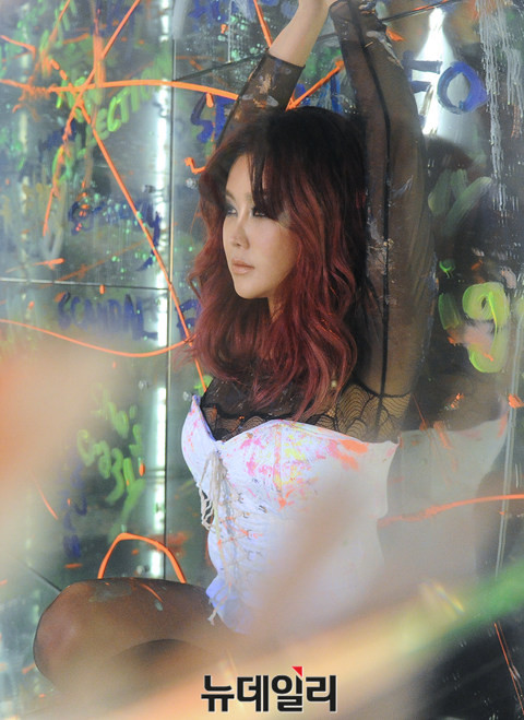 가수 솔비(권지안)가 11일 오후 서울 영등포구 안국약품 갤러리AG에서 새 싱글앨범 '블랙스완'의 발매 기념 쇼케이스를 열고 퍼포먼스를 선보이고 있다.