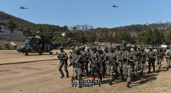 육군 제2작전사령부가 지난 10일 경북 영천 일대에서 특공부대 장병 250여 명과 헬기 20대를 작전지역에 신속히 전개해 적을 격멸하는 훈련을 언론에 공개했다.