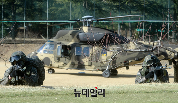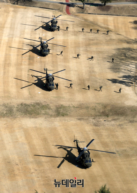 육군 제2작전사령부가 지난 10일 경북 영천 일대에서 특공부대 장병 250여 명과 헬기 20대를 작전지역에 신속히 전개해 적을 격멸하는 훈련을 언론에 공개했다.