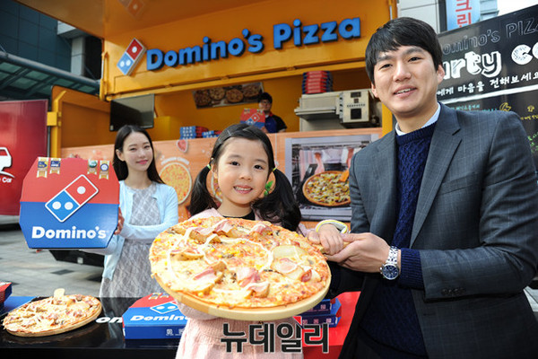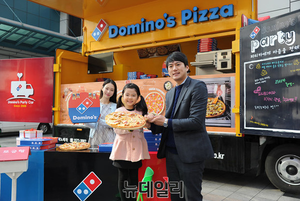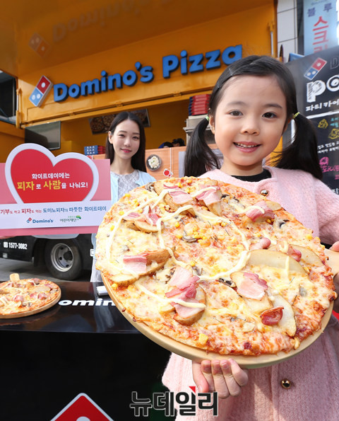 도미노피자가 14일 오전 서울 중구 초록우산 어린이재단 광장에서 새롭게 단장한 파티카로 화이트데이를 맞아 주변 이웃과 소통하는 피자 나눔 파티를 진행했다.