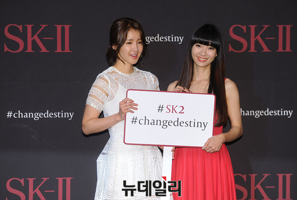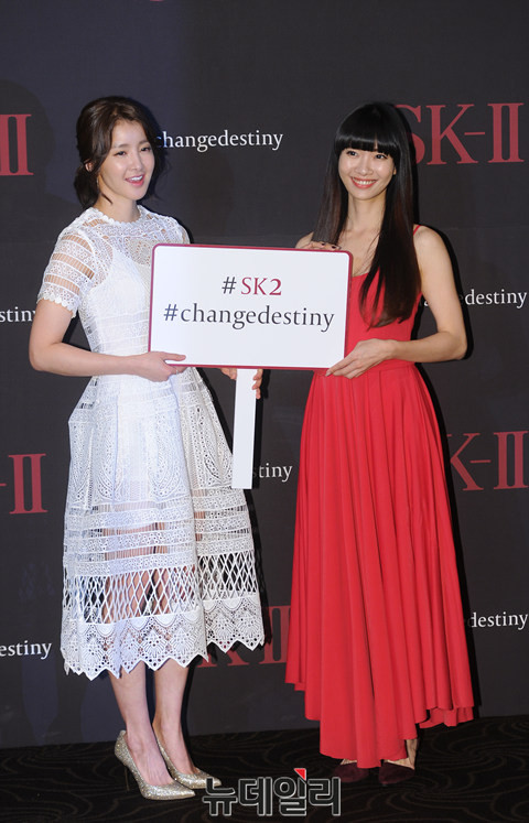 SK-II 홍보대사로 선정된 배우 이시영과 대만 댄서 린칭란이 14일 오후 서울 장충동 신라호텔에서 진행된 체인지 데스티니(changedestiny) 캠페인 런칭 행사에 참석해 포즈를 취하고 있다.