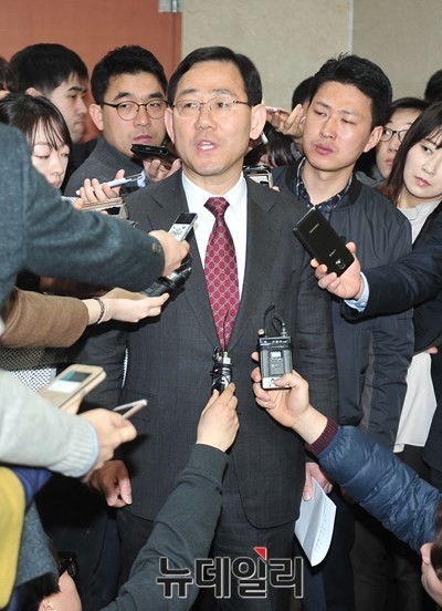 주호영 새누리당 의원이 15일 오전 서울 여의도 국회 정론관에서 본인의 공천 배제과련 기자회견을 갖고 기자들의 질문에 답하고 있다.