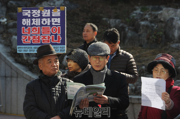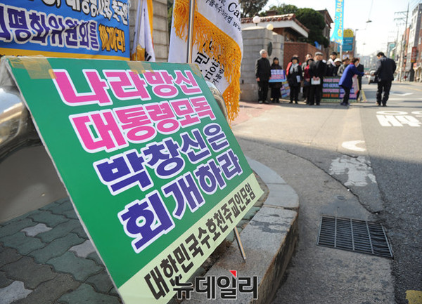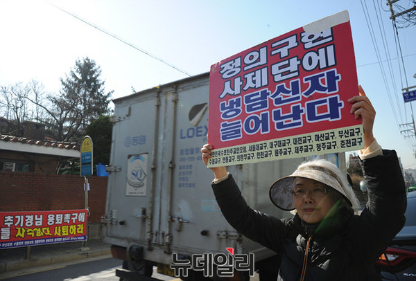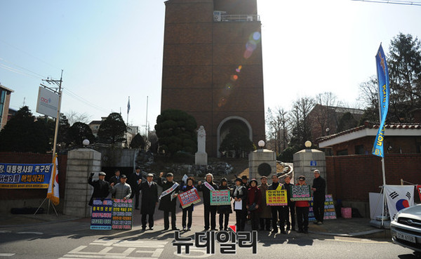 자유민주주의 성향 천주교 신자 단체 대한민국수호천주교인모임(이하 대수천) 회원 20여명이 15일 오전 서울 광진구 중곡동 한국천주교중앙협의회 앞에서 기자회견을 갖고 있다.