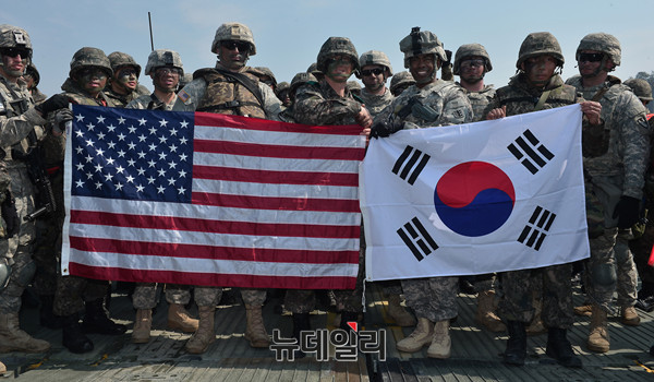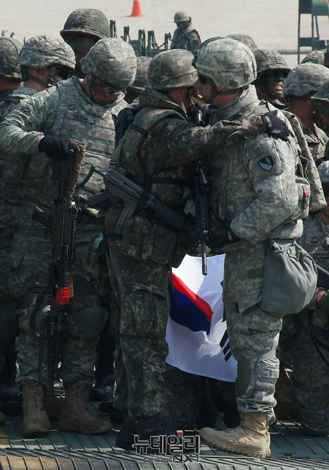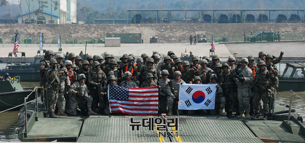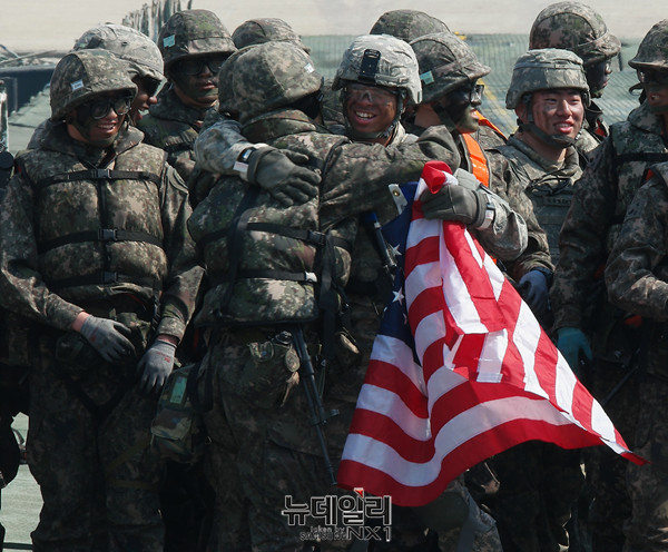 한미 공병부대가 16일 오전 경기 이천 7공병여단 도하훈련장에서 한미연합 도하훈련을 공개했다. 이날 훈련을 마친 공병대대 장병들이 서로를 격려하고 있다.