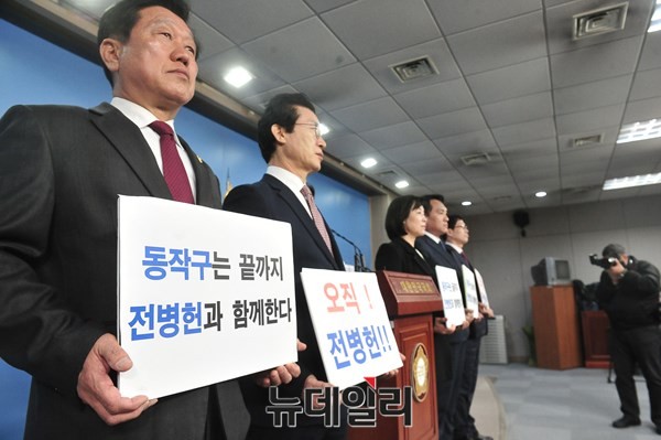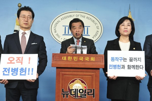 전병헌 더불어민주당 의원의 지역구 지지자들이 17일 오전 서울 여의도 국회 정론관에서 전 의원의 컷오프 철회 촉구 기자회견 하고 있다.