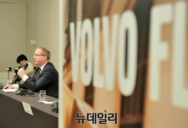 볼보그룹 마틴 룬스테드(Martin Lundstedt) 신임회장이 17일 오후 서울 강서구 외발산동 메이필드 호텔에서 열린 열린 기자간담회에서 모두발언을 하고 있다.