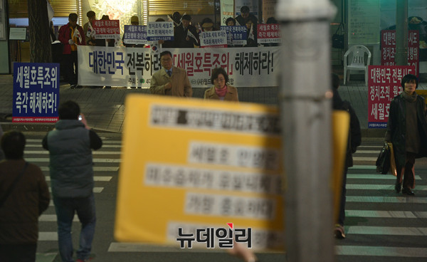 엄마부대봉사단이 17일 오후 5시 30분부터 서울 조계사 앞에서 기자회견을 열고, "세월호를 빙자해 국가혼란 선동하는 종교계는 각성하라"고 주장했다.