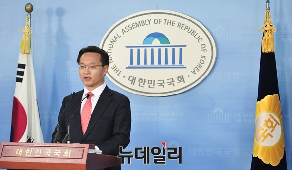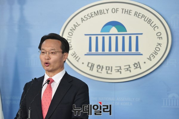 새누리당 공천에 탈락한 조해진 의원이 18일 오전 서울 여의도 국회 정론관에서 기자회견을 갖고 탈당 및 무소속 출마 선언을 하고 있다.