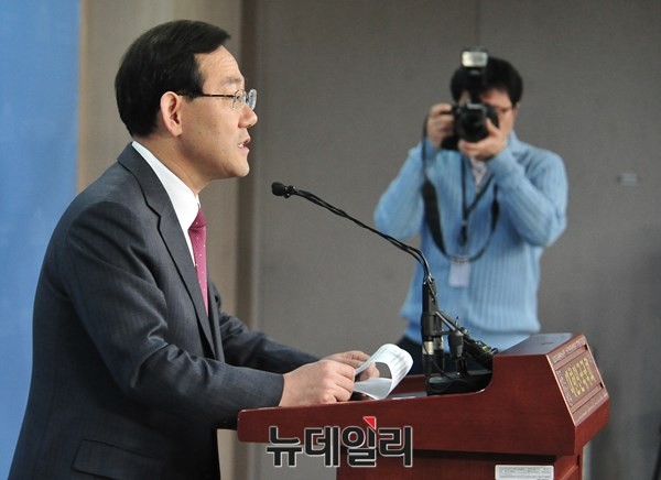 새누리당 공천에 탈락한 주호영 의원이 18일 오전 서울 여의도 국회 정론관에서 기자회견을 갖고 재심청구 기각에 대해 발언하고 있다.