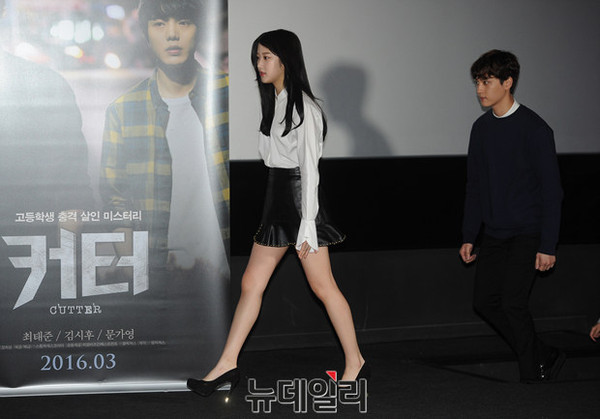 영화 '커터' 언론시사회가 18일 오후 서울 성동구 왕십리 CGV에서 열렸다. 배우 문가영이 무대위에 오르고 있다.
