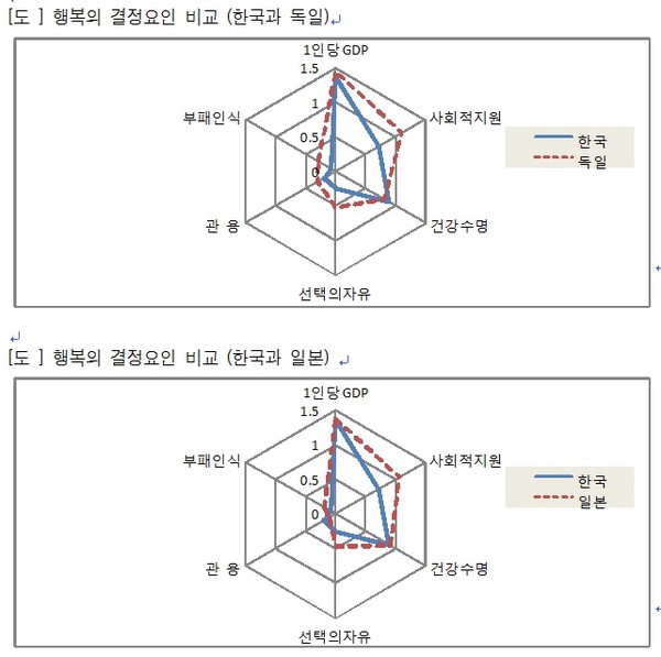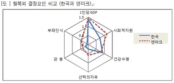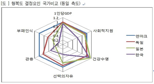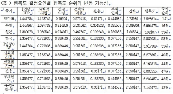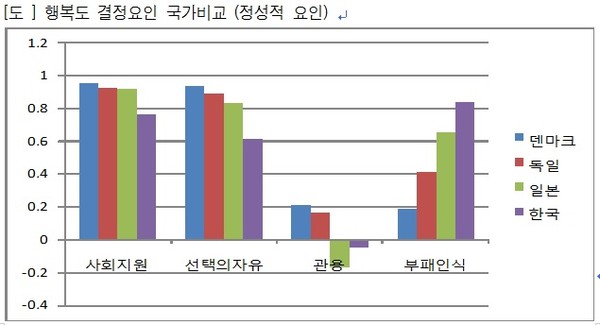 행복은 국민 개개인이 느끼는 감정이지만 국가 전반적으로 평가되는 행복지수가 낮다는 것은 국가의 기본 프레임과 관계가 있다. 한국은 70년의 짧은 기간에 후진국에서 선진국으로의 진입에 성공한 모범적 국가임에 틀림이 없다. 이러한 성공은 한국인의 우수한 자질과 근면성에 기인한 것이지만, 국민 모두가 열심히 일하게 만드는, 일할 수밖에 없게 만드는 잘 짜인 효율적인 국가 프레임이 오늘날의 경제적 번영을 가져왔다고 할 수 있다. 그러나 이러한 프레임의 한계가 나라 곳곳에서 나타나고 있다. 이러한 프레임을 개혁하지 않는 한 국민행복도 개선되기 어렵다는 것을 위의 분석에서 알 수 있고, 이를 위해서는 정신적 문화적 선진화가 시급하다.
