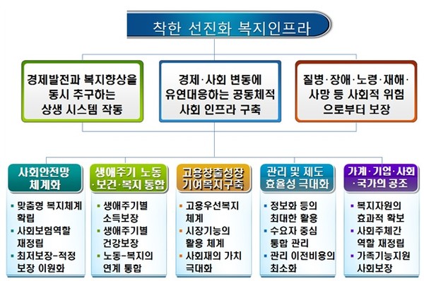 이를 위해서는 첫째, 빈곤‧실업‧질병‧재해‧장애‧노령 등 사회적 위험에 효율적으로 대처할 수 있는 「사회안전망」을 완성하여 사회통합을 달성해야 한다. 둘째, 생애주기적으로 평생 건강하고 안정된 생활이 보장되며, 다양한 복지서비스가 통합 관리될 수 있도록 노동‧보건‧복지 통합적 시스템을 구축한다. 셋째, 사회보장 시스템이 사회 경제적 자원을 효율적이고 공평하게 배분될 수 있도록 설계하여 복지가 고용창출 및 성장에 기여할 수 있도록 정립한다. 넷째, 「제도간 연계」, 「정보화」, 「경쟁과 책임경영」 시스템의 도입으로 수요자중심의 통합적인 서비스가 제공되어 제도의 효율성 극대화한다. 다섯째, 사회보장 시스템이 약화되는 가족기능을 강화시킬 있도록 정부-국민, 근로자-사용자, 앙-지방 간에 신뢰와 협력체계를 구축한다.