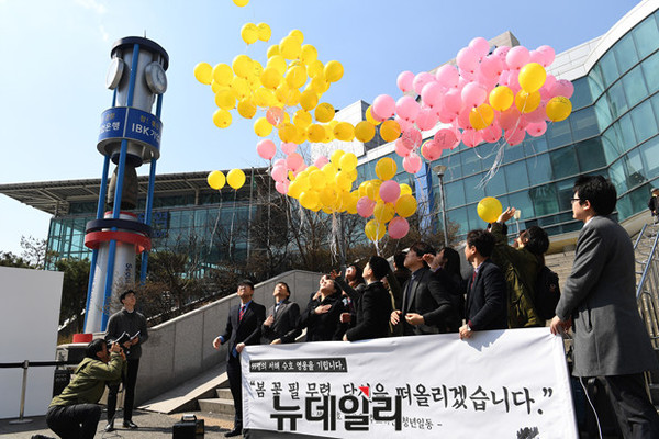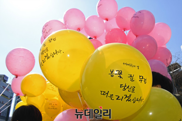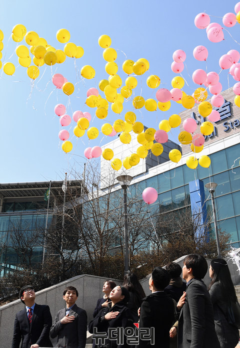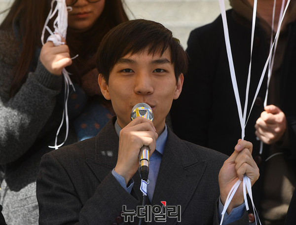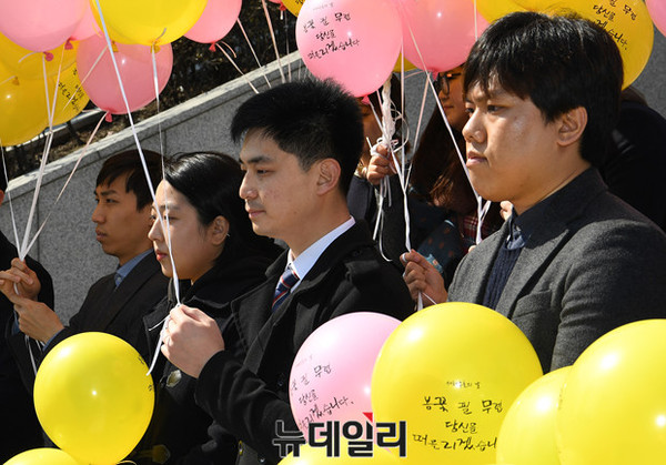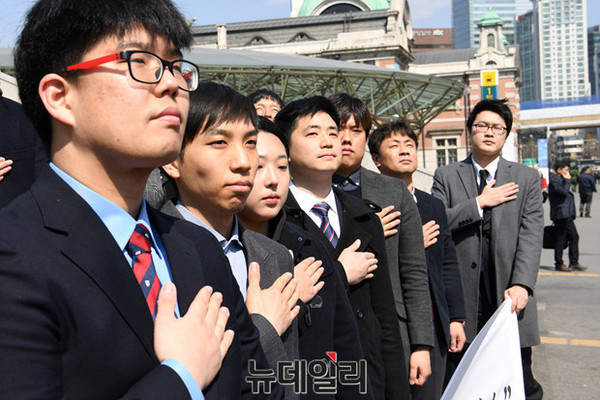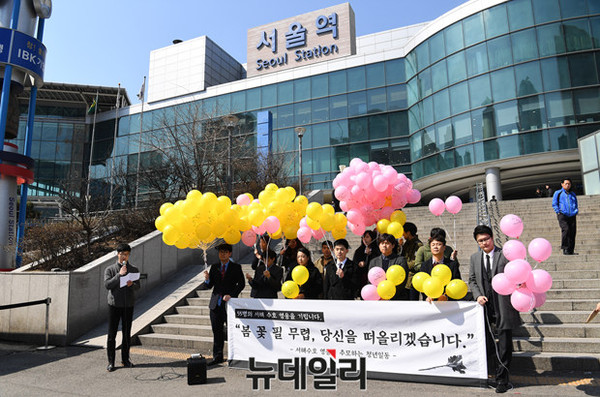 제1회 '서해 수호의 날'을 하루 앞둔 24일 오전 서울역 앞에서 대한민국청년대학생연합, 새빛한올 등 청년 애국단체 회원 30여명이 서해수호 영웅들을 추모하는 성명서 낭독과 함께 퍼포먼스를 하고 있다.