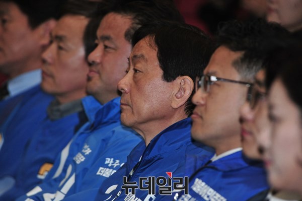 새누리당을 탈당해 더불어민주당에 입당한 진영 의원이 24일 오전 서울 여의도 국회 의원회관에서 열린 공천장수여식에 참석해 수여식을 바라보고 있다.