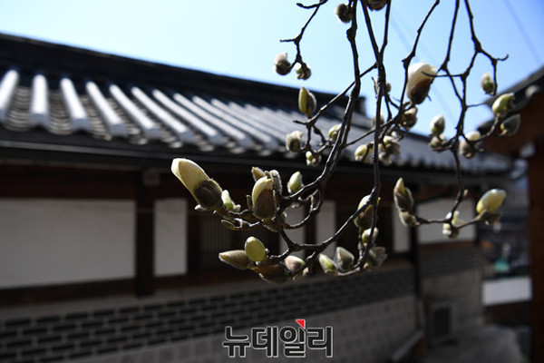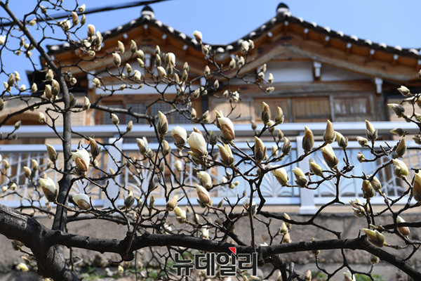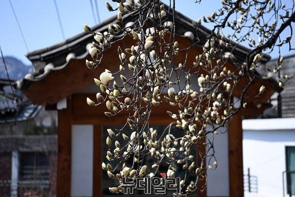 전국이 대체로 맑은 가운데 24일 서울 종로구 삼청동 한 한옥 앞에 목련이 꽃망울을 터트리고 만개를 준비하고 있다.