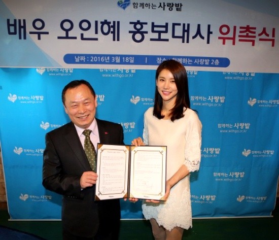 '함께하는 사랑밭' 미디어홍보팀 관계자는 "오인혜 씨가 홍보대사 활동에 매우 적극적"이라며 "앞으로 화상메디컬, 에너지지원 사업, 오지마을 봉사 등 다양한 분야에서 나눔을 실천할 계획"이라고 밝혔다.