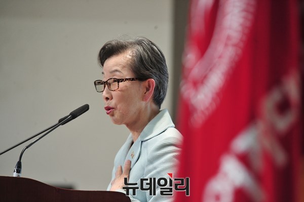 이승만 건국대통령 탄신 '141주년 기념식 및 석상제막식'이 25일 오후 경인여대에서 열린 가운데 김길자 경인여대 총장이 축사를 하고 있다.대한민국사랑회가 경인여대에 기증한 이승만 대통령 석상은 조각가 강관욱 씨의 작품으로 높이가 약 3m에 달하며 오른손을 왼쪽 가슴에 얹고 있는 형태의 전신상이다.이날 행사는 김길자 경인여대 총장, 이승만 전 대통령의 아들 이인수 박사, 소설가 복거일, 이승윤 전 부총리, 애국단체총협의회 이상윤 회장, 김경재 자유총연맹 회장 등 각계각층 인사 200여 명이 참석했다.