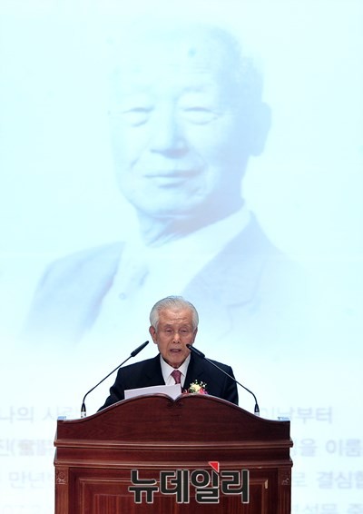 이승만 건국대통령 탄신 '141주년 기념식 및 석상 제막식'이 25일 오후 경인여대에서 열린 가운데 이승만 전 대통령의 아들 이인수 박사가 참석자들에게 감사의 인사를 전하고 있다.대한민국사랑회가 경인여대에 기증한 이승만 대통령 석상은 조각가 강관욱 씨의 작품으로 높이가 약 3m에 달하며 오른손을 왼쪽 가슴에 얹고 있는 형태의 전신상이다.이날 행사는 김길자 경인여대 총장, 이승만 전 대통령의 아들 이인수 박사, 소설가 복거일, 이승윤 전 부총리, 애국단체총협의회 이상윤 회장, 김경재 자유총연맹 회장 등 각계각층 인사 200여 명이 참석했다.