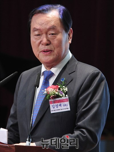 이승만 건국대통령 탄신 '141주년 기념식 및 석상 제막식'이 25일 오후 경인여대에서 열린 가운데 김경재 자유총연맹 회장이 축사를 하고 있다.대한민국사랑회가 경인여대에 기증한 이승만 대통령 석상은 조각가 강관욱 씨의 작품으로 높이가 약 3m에 달하며 오른손을 왼쪽 가슴에 얹고 있는 형태의 전신상이다.이날 행사는 김길자 경인여대 총장, 이승만 전 대통령의 아들 이인수 박사, 소설가 복거일, 이승윤 전 부총리, 애국단체총협의회 이상윤 회장, 김경재 자유총연맹 회장 등 각계각층 인사 200여 명이 참석했다.