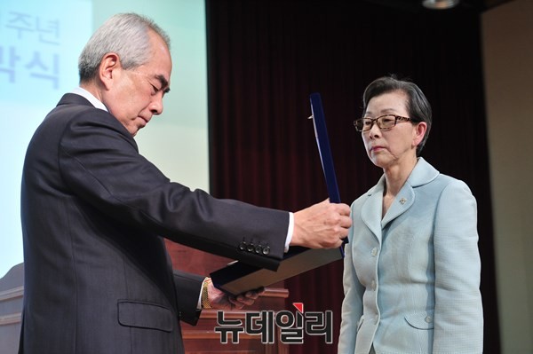 이승만 건국대통령 탄신 '141주년 기념식 및 석상제막식'이 25일 오후 경인여대에서 열린 가운데 김영수 대한민국 사랑회 이사장이 김기자 경인여대 총장에게 이승만 대통령 석상 기증패를 전달하고 있다.이승만 대통령 석상은 조각가 강관욱 씨의 작품으로 높이가 약 3m에 달하며 오른손을 왼쪽 가슴에 얹고 있는 형태의 전신상으로 대한민국사랑회로 부터 경인여대에 기증됐다.이날 행사는 김길자 경인여대 총장, 이승만 전 대통령의 아들 이인수 박사, 소설가 복거일, 이승윤 전 부총리, 애국단체총협의회 이상훈, 김경재 자유총연맹 회장 등 각계각층 인사 200여 명이 참석했다.
