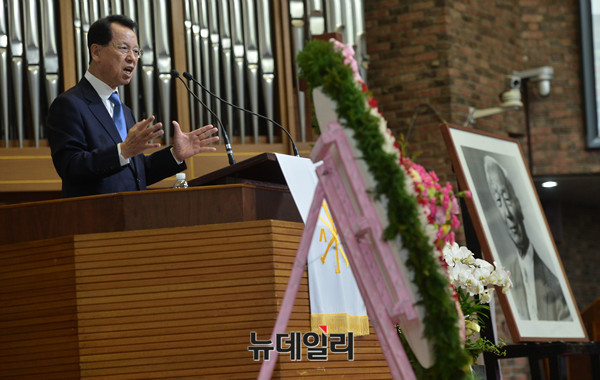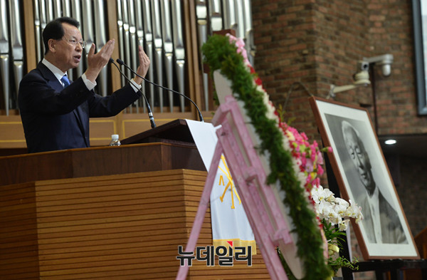 건국대통령이승만박사기념사업회가 26일 오후 서울 중구 제일정동교회에서 '건국대통령 이승만박사 탄신 141주년 기념식'을 개최했다. 예배로 진행된 이날 기념식에서 명성교회 김삼환 원로목사가 설교를 하고 있다.