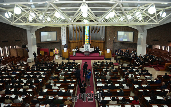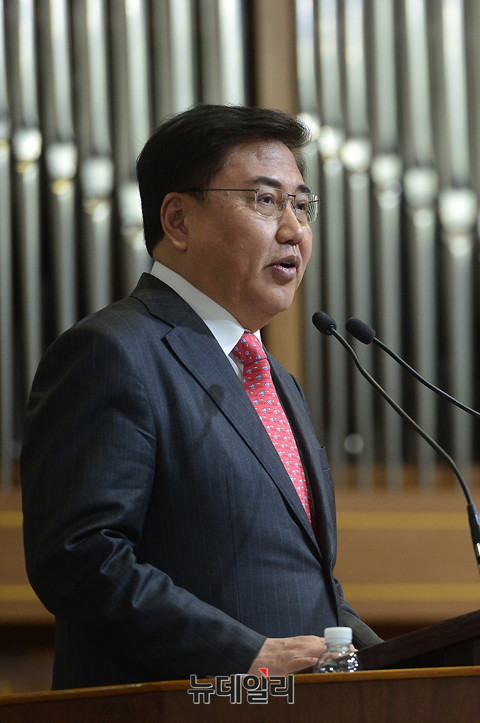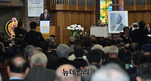 건국대통령이승만박사기념사업회가 26일 오후 서울 중구 제일정동교회에서 '건국대통령 이승만박사 탄신 141주년 기념식'을 개최했다. 기념사업회 박진 회장이 기념사를 하고 있다.