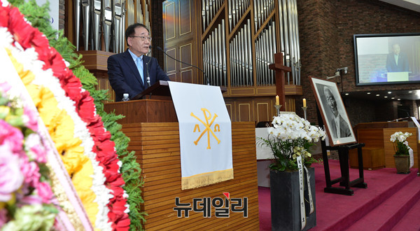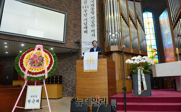 건국대통령이승만박사기념사업회가 26일 오후 서울 중구 제일정동교회에서 '건국대통령 이승만박사 탄신 141주년 기념식'을 개최했다. 기념식에 참석한 연세대학교 김용학 총장이 축사를 하고 있다.