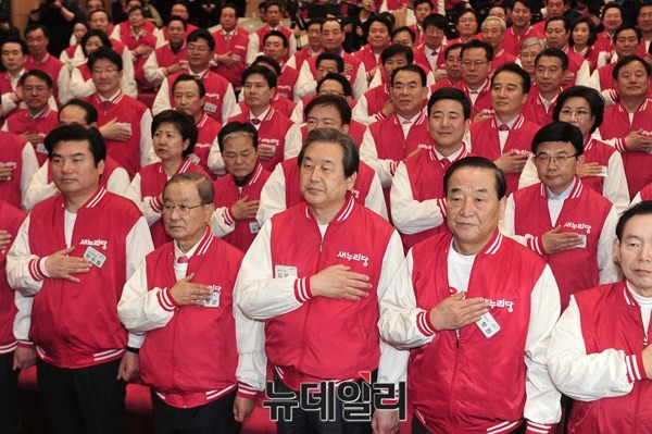새누리당 20대 총선 공천자대회가 28일 오후 서울 여의도 국회의원회관에서 열린 가운데 김무성, 원유철, 서청원, 이인제, 강봉균 새누리당 공동선대위원장들과 공천자들이 국민의례를 하고 있다.