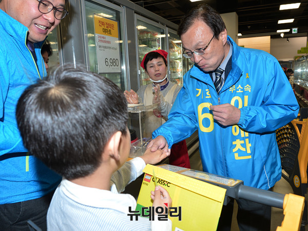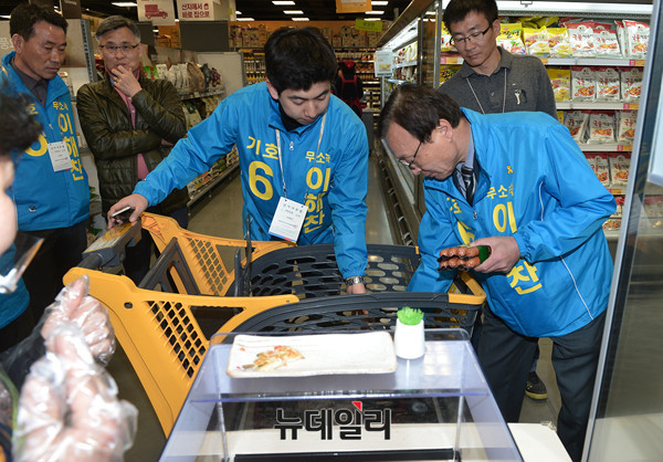 무소속으로 세종특별자치시 국회의원 선거에 나선 이해찬 후보가 1일 오후 이마트세종점을 방문해 선거 유세를 이어갔다. 이 후보는 이날 마트에서 선거원들과 먹을 간식거리로 '소시지, 와인, 초밥' 등을 직접 구매했다.