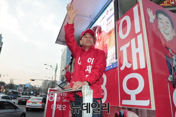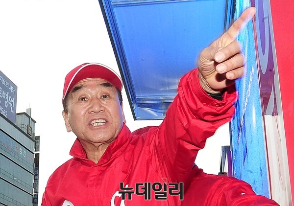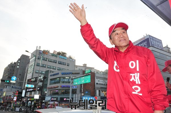 서울 은평구을에 무소속으로 출마한 이재오 후보가 1일 오후 서울 은평구 불광역사거리에서 거리인사를 하고 있다.
