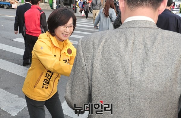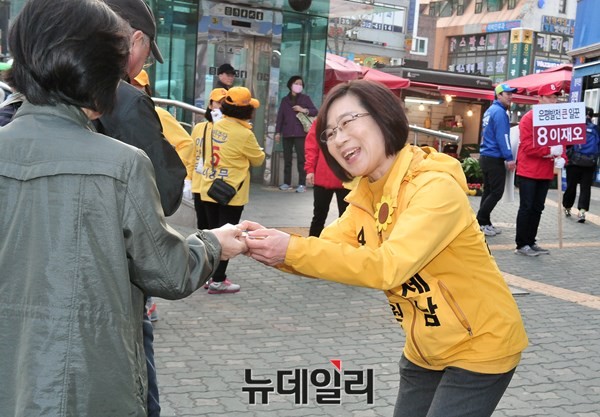 서울 은평구을 정의당 김제남 후보가 1일 오후 서울 은평구 불광역사거리에서 거리인사를 하고 있다.