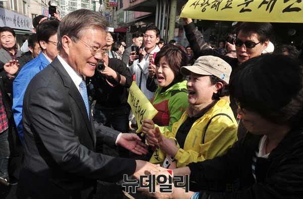 더불어민주당 문재인 전 대표가 1일 오후 진성준 후보의 지역구인 서울 강서구 방신시장을 찾아 진 후보의 지지를 호소하고 있다.