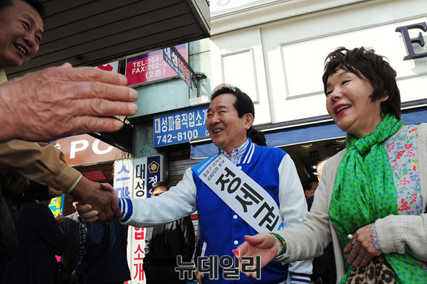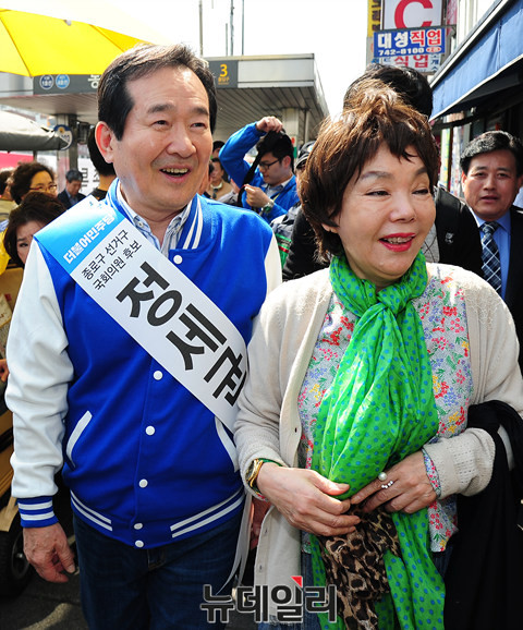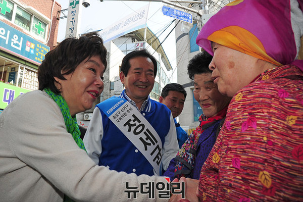 더불어민주당 정세균 후보와 배우 김수미가 2일 오후 서울 종로구 창신시장을 찾아 상인들에게 지지를 호소하고 있다.