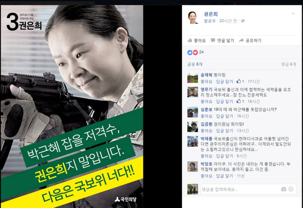 광주 광산을(乙)에서 국민의당 후보로 출마하는 권은희 의원이 대통령 저격을 연상케 하는 포스터를 자신의 페이스북에 올렸다.