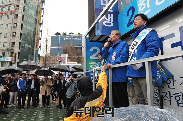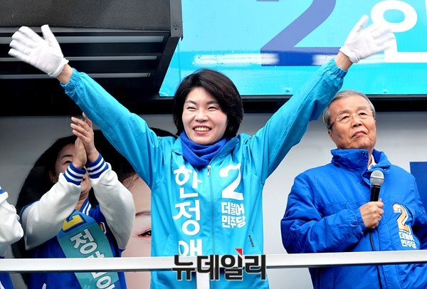 김종인 더불어민주당 비상대책위원회 대표가 3일 오후 서울 강서구 화곡역 사거리에서 강서갑 금태섭, 강서병 한정애 후보와 거리유세를 하고 있다.