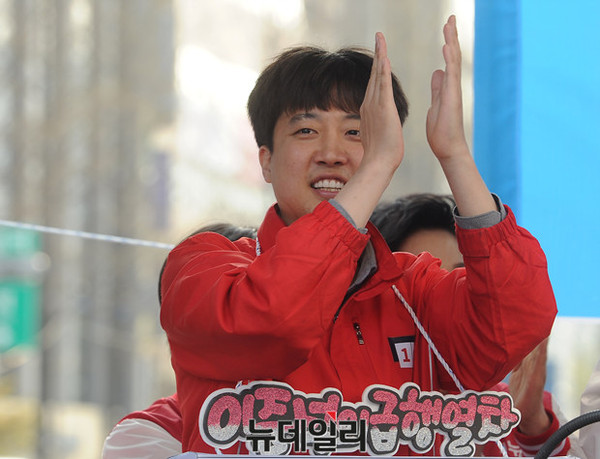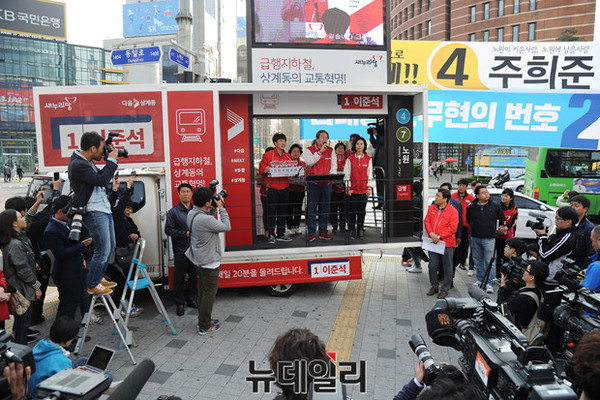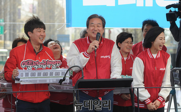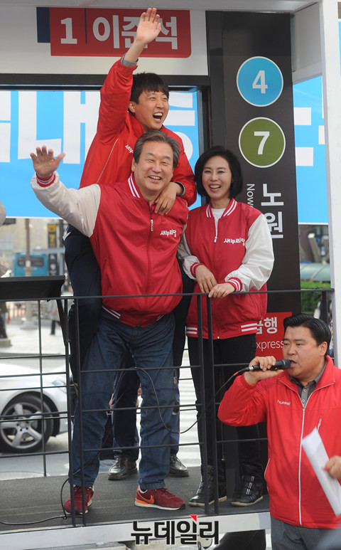 새누리당 김무성 대표가 7일 오후 서울 노원구 노원역 인근에서 이준석(서울 노원병) 후보 지원유세 중인 가운데 이준석 후보를 업고 손인사를 하고 있다.