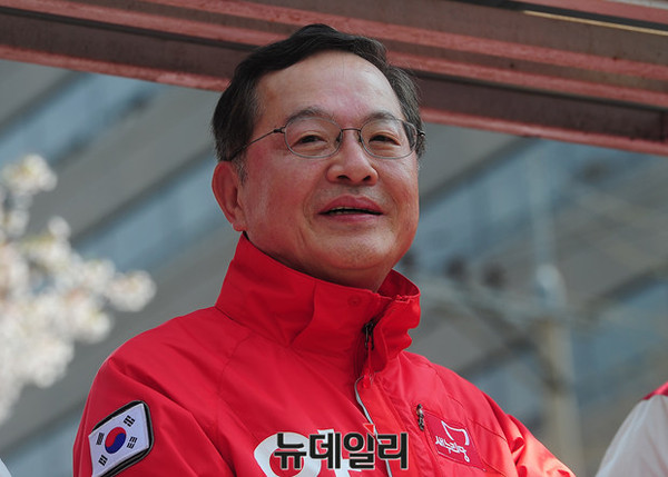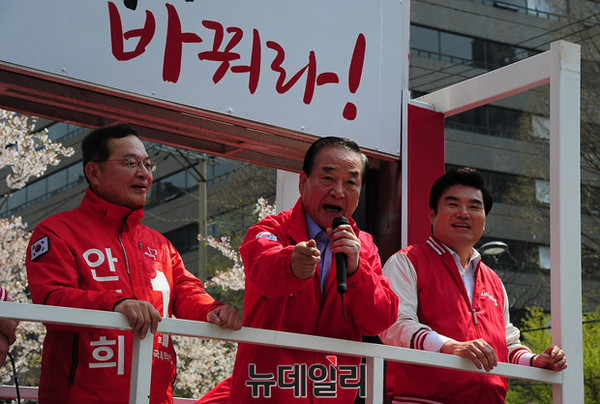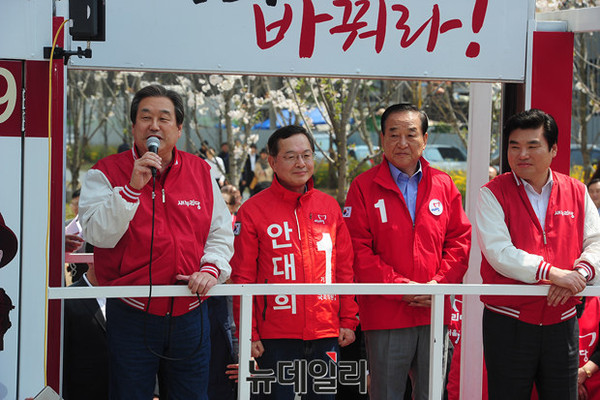 새누리당 공동선대위원장인 김무성 대표, 원유철 원내대표, 서청원 최고위원 등 새누리당 지도부가 7일 오후 서울 마포구 공덕역 인근에서 안대희(서울 마포갑) 후보의 유세를 지원하고 있다.