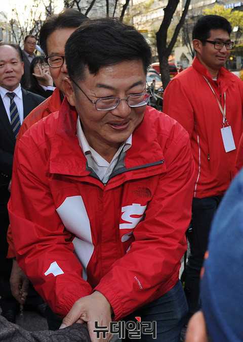 새누리당 홍범식(서울 노원을)후보가 7일 오후 서울 중계동 은행사거리에서 열린 거리유세에서 김황식 전 총리와 함께 지지를 호소하고 있다.