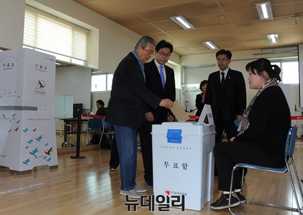 김종인 더불어민주당 비상대책위원회 대표가 8일 오전 인천 연수구 동춘3동주민센터에서 제20대 국회의원 선거 사전투표를 하고 있다.