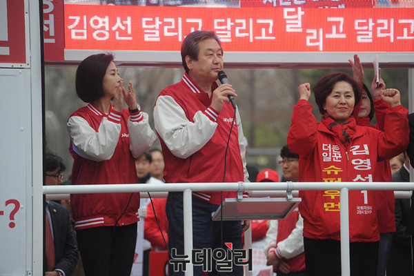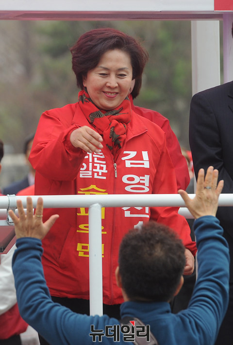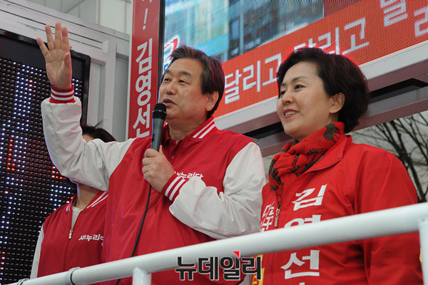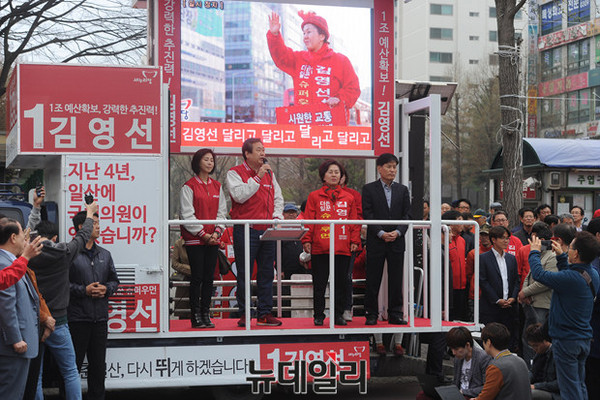 새누리당 김무성 대표가 8일 오후 경기 고영시 일산서구 주엽역 앞에서 열린 김영선(고양정)후보 지원유세에서 지지를 호소하고 있다.